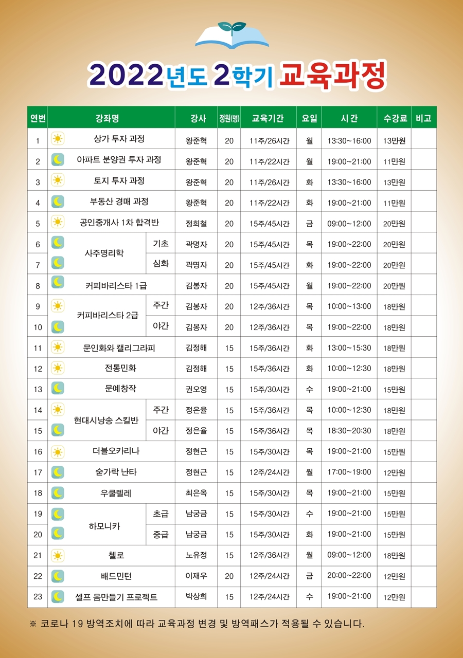 5. 기타사항 : 코로나 19 방역조치에 따라 교육과정 변경 및 접종증명 음성확인제(방역패스)가 적용될 수 있습니다.