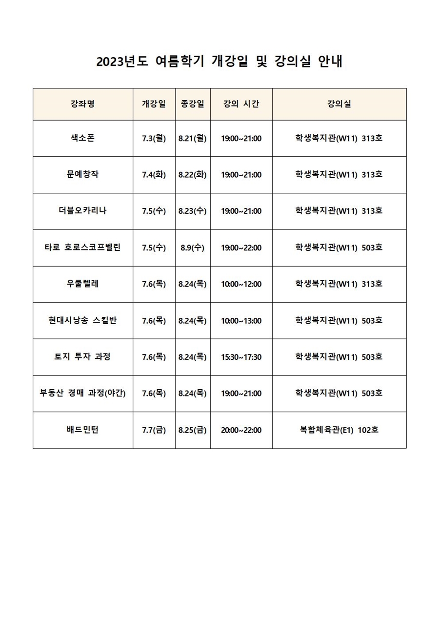 2023년도 여름학기 개강일 및 강의실 안내