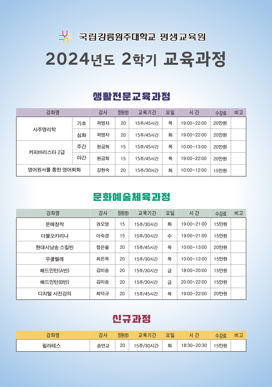 5. 기타사항 : 평생교육원 사정에 따라 수업일정, 강사, 인원 등이 변경될 수 있습니다.